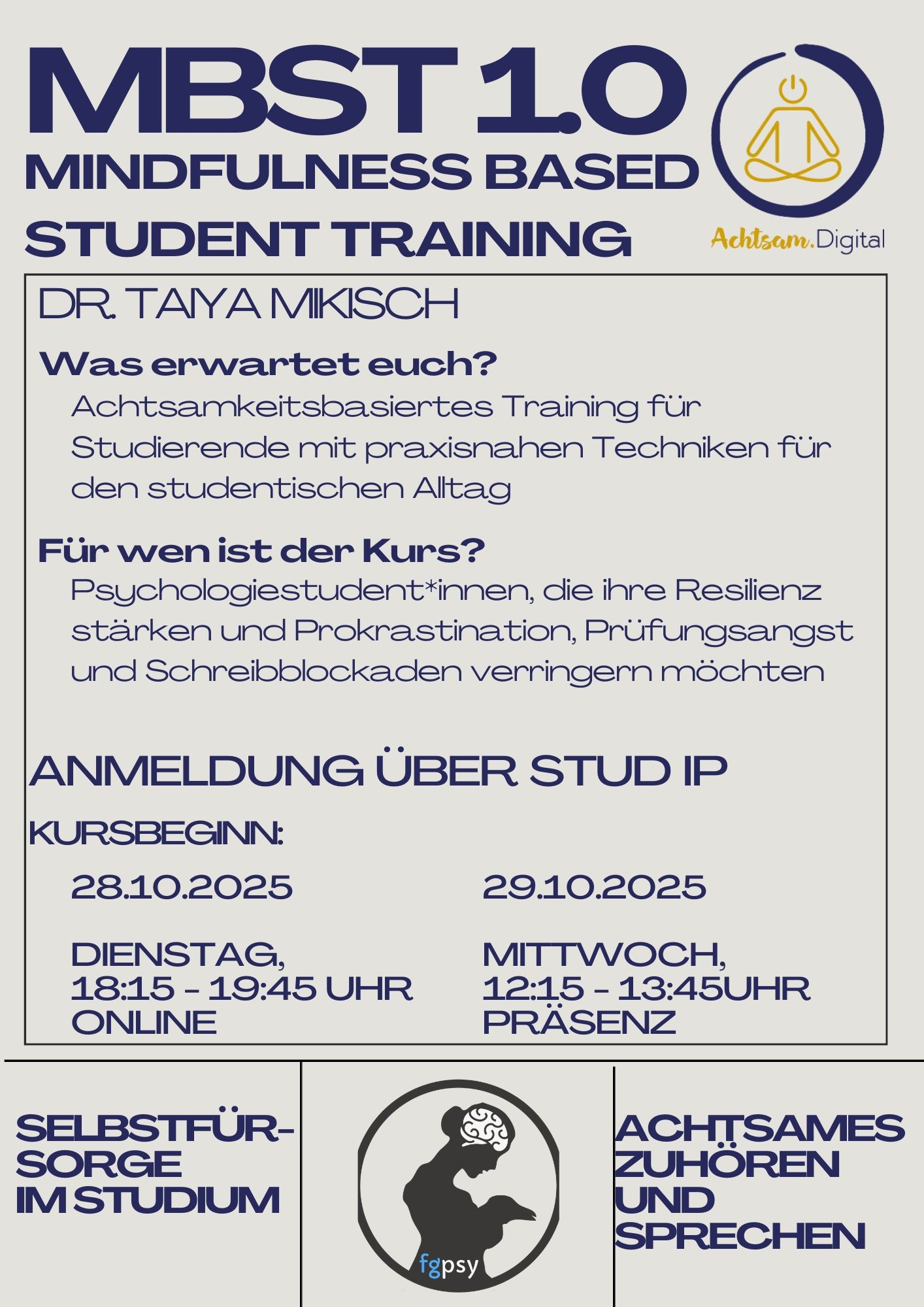 auch im kommenden Wintersemester finanzieren wir über die Studienqualitätsmittel (SQM) der Fachgruppe wieder einen empirisch evaluierten Achtsamkeitskurs für uns Psychologie-Studis, der speziell für Studierende im medizinischen Bereich entwickelt wurde. Thematisch geht es dementsprechend darum, einen guten Umgang mit einem leistungsorientierten Studium zu finden sowie Techniken zu erlernen, die später auch in einem z.T. emotional herausfordernden Beruf zur Selbstfürsorge sinnvoll sind.