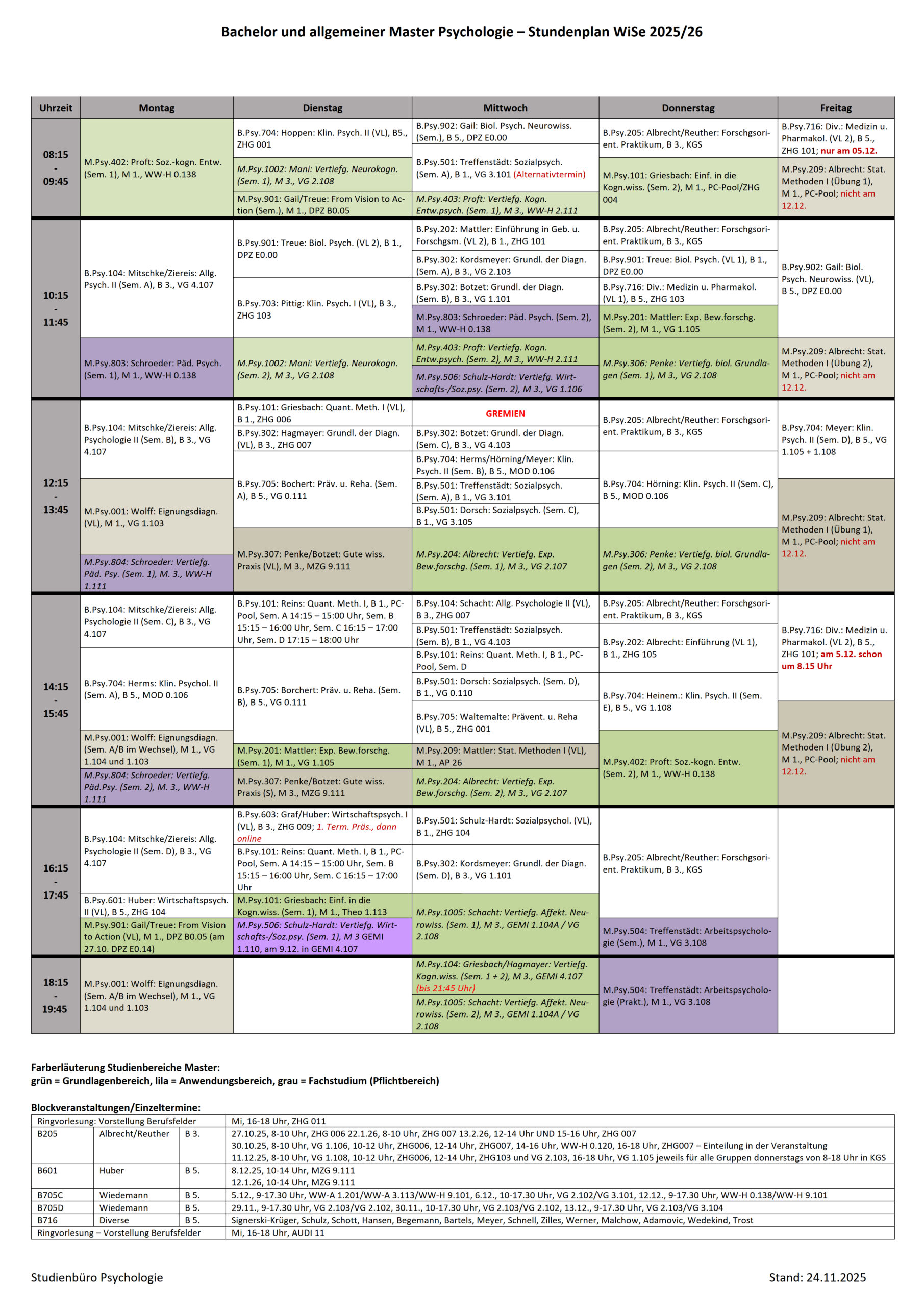 Die angebotenen Veranstaltungen für das Wintersemester 25/26 können den Studienplänen (Bachelor / Master) sowie dem vorläufigen Stundenplan entnommen werden.