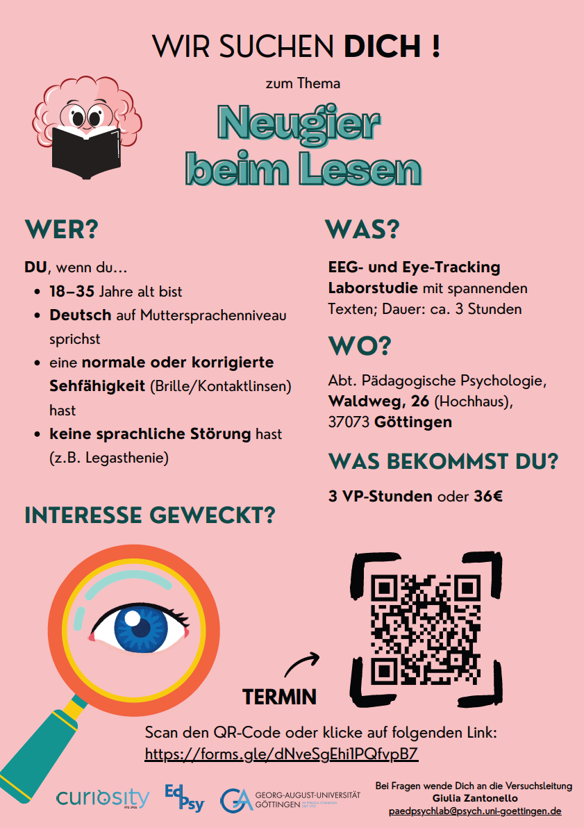 Wir vom Forschungsteam der Abteilung für Pädagogische Psychologie suchen Teilnehmer*innen für eine Laborstudie, in der untersucht wird, wie Neugier mit kognitiven Prozessen beim Lesen zusammenhängt.